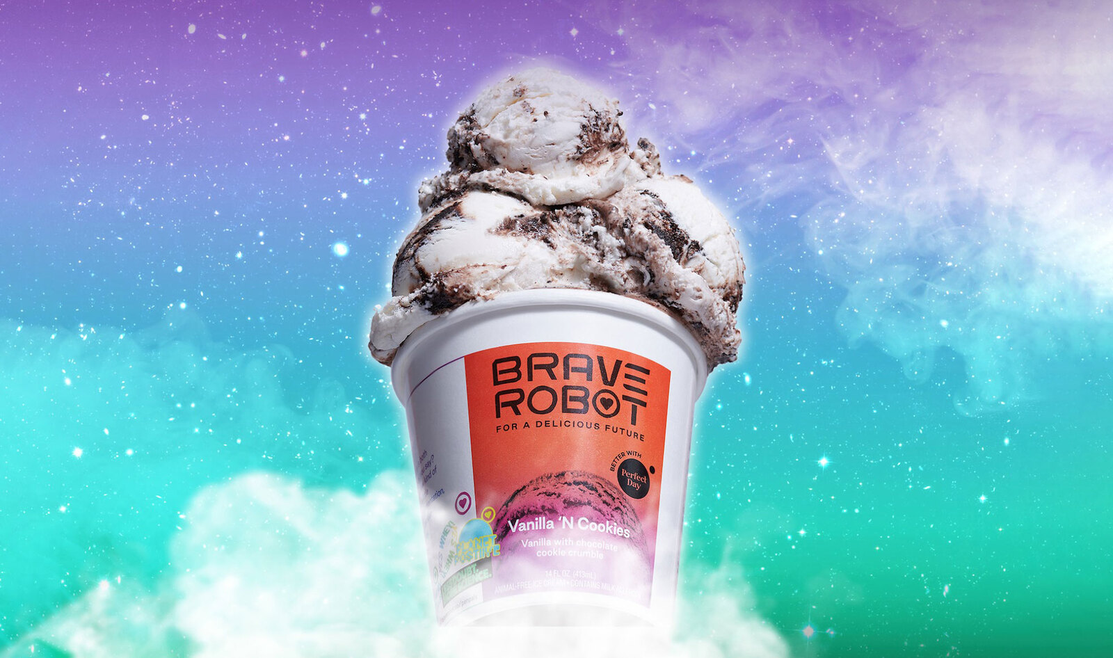 The Brave Robot brand is the first product line from The Urgent Company, a new sustainably focused consumer food company founded by alternative dairy protein manufacturer Perfect Day and longtime dairy product developer Paul Kollesoff. Brave Robot ice cream uses Perfect Day’s dairy-identical but animal-free whey protein, which is made by inserting a cow’s DNA sequence as a blueprint into yeast-based microflora. The microflora then takes the place of the cow in creating a protein that can be used to make vegan versions of dairy-based food such as milk, cheese, and ice cream.