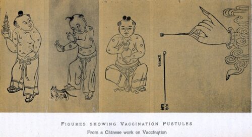 It is also recorded that inoculation against smallpox was already being practiced in Sichuan province by Taoist alchemists in the 10th century CE.3 The Chinese inoculators administered dead or attenuated smallpox collected from less virulent scabs, which were inserted into the nose on a plug of cotton. Inoculation may also have been practiced much earlier by the Chinese — some sources cite dates as early as 200 BCE.