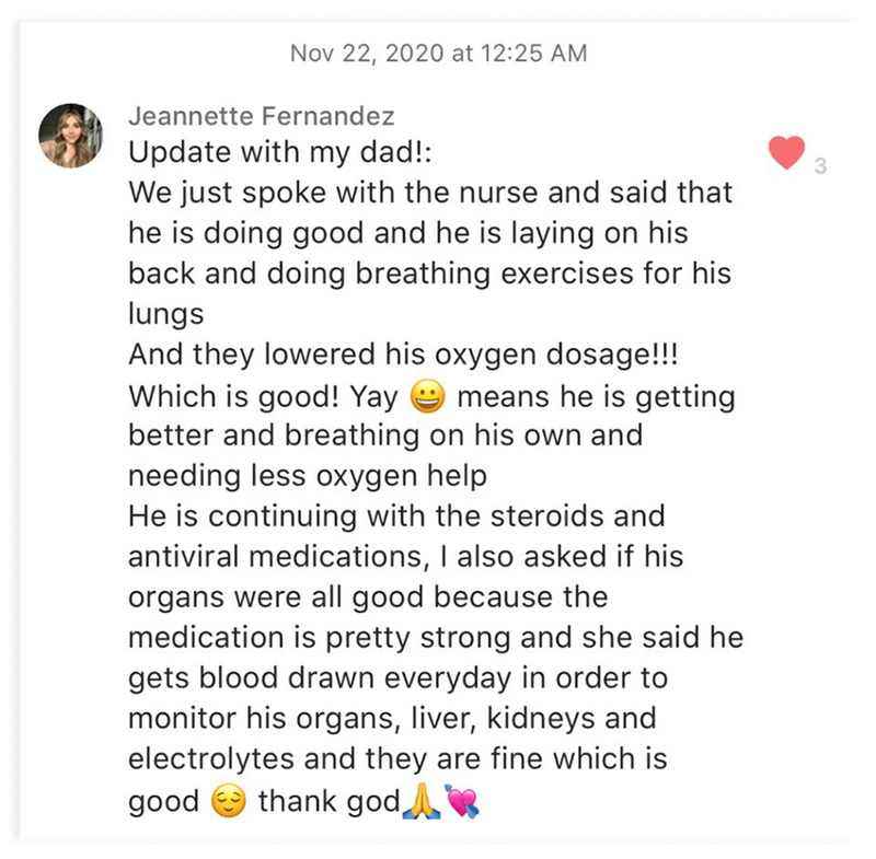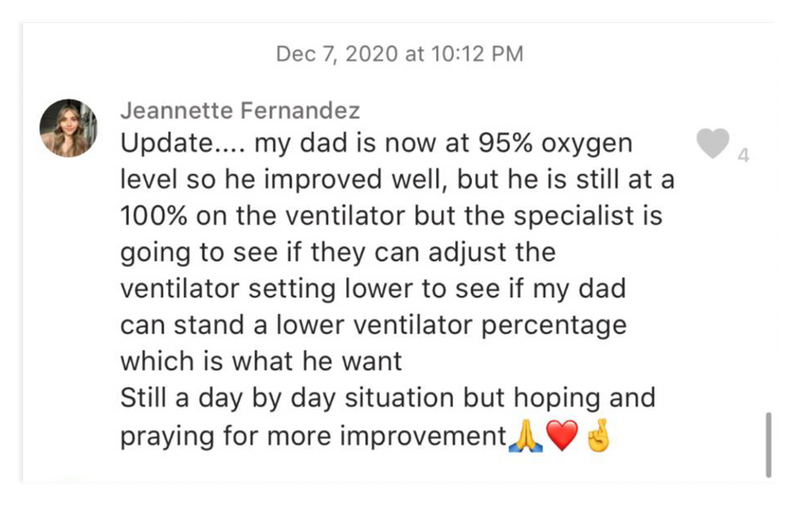 Jeannette actualizó al grupo de mensajes de texto el 7 de diciembre, informando que Miguel aún dependía del respirador artificial.