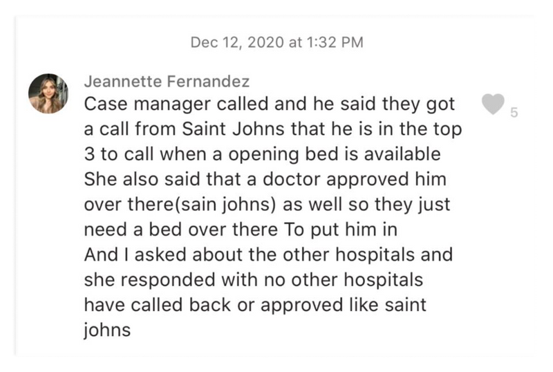 Jeannette actualizó al grupo de mensajes de texto el 12 de diciembre, informando que Miguel tenía uno de los tres lugares principales en la lista de personas que esperaban una cama de cuidados intensivos en el Centro Médico Providence Saint John.