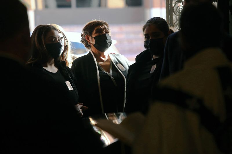 El espectro de COVID-19 se cernió sobre la ceremonia. Todos traían cubrebocas. La madre de Miguel se desplomó sobre el féretro, sujetándose con las manos cubiertas de guantes médicos transparentes. Llevaba puesto un protector facial y un cubrebocas de tela.