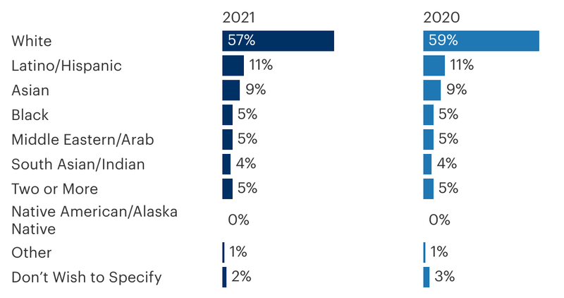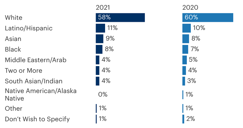 Note: We use the term “people of color” to refer to anyone in the following groups: Asian, Black, Latino/Hispanic, Middle Eastern/Arab, Native American/Alaska Native, South Asian/Indian, or two or more races. Percentages may not add up to 100 because of rounding.