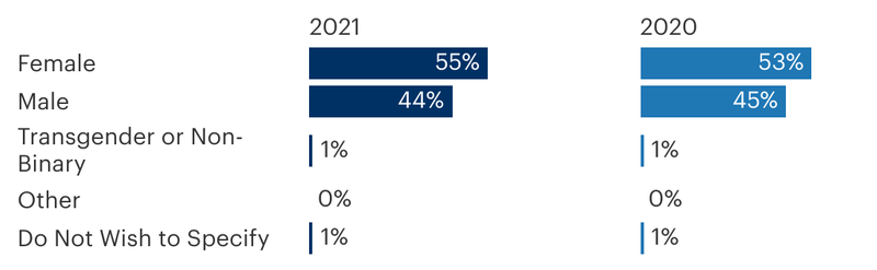 As with last year, we tracked candidates through the application and interview process. Out of 31 jobs posted in 2020, 47% of the candidates we interviewed identified as people of color and 64% as women. Of those we hired, 58% self-identified as people of color, and 66% as women.