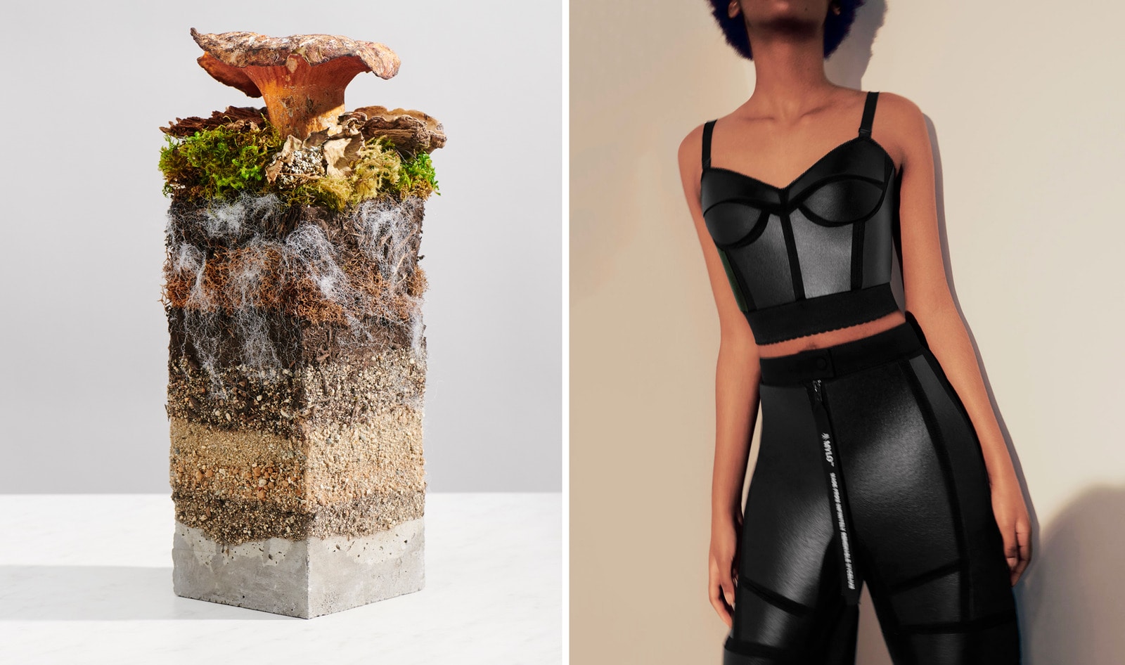 Today, eco-conscious designer Stella McCartney unveiled two garments—a bustier and trousers—made with mushroom-based vegan leather Mylo. The luxury designer is the first in the world to use the innovative material, developed by biotechnology startup Bolt Threads, to create garments. Created at McCartney’s atelier in London, both the bustier and trousers are made with recycled scuba nylon and panels of Mylo, which is a material Bolt Threads made from fast-growing mycelium (mushroom root systems). The avant-garde garments are not available for purchase but were created to show the potential of Mylo, which McCartney will feature in future designs.