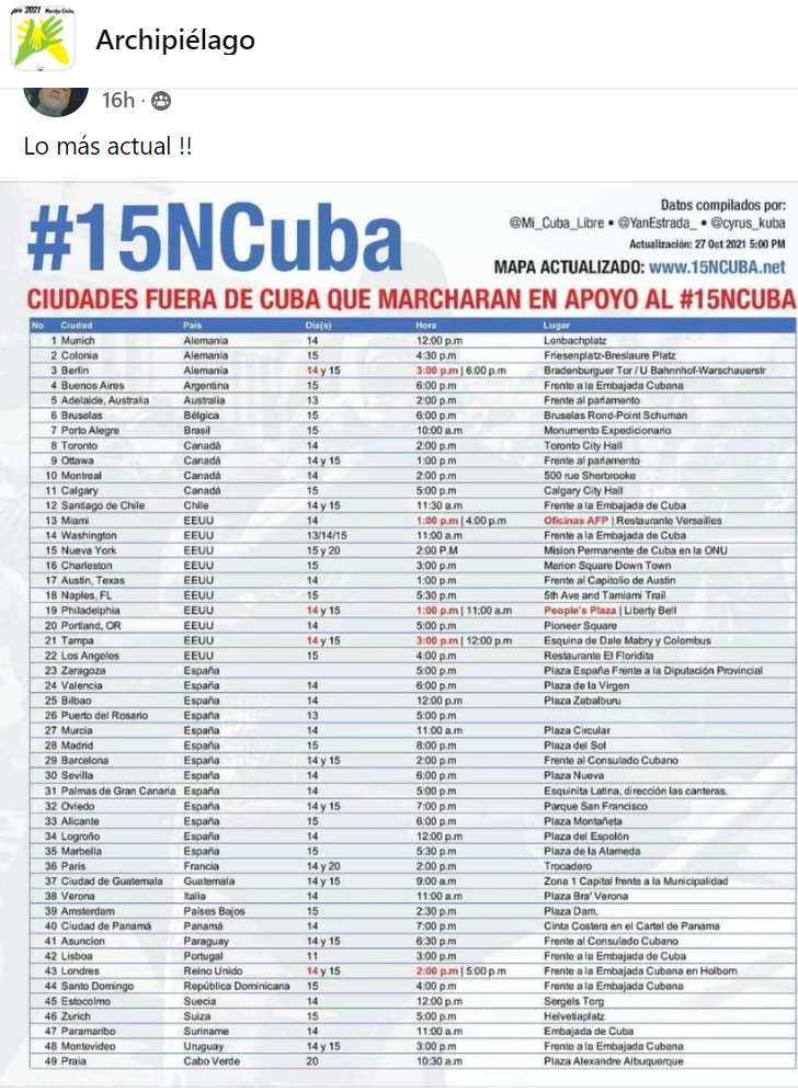 L’un des principaux ingrédients des efforts de déstabilisation déployés par Archipiélago est d’internationaliser le mouvement de protestation. Les membres tiennent un tableau régulièrement mis à jour indiquant où sont prévues les marches pro-15 novembre à l’extérieur de Cuba. Ceux-ci sont presque tous situés en Amérique du Nord et en Europe, où se trouvent les exilés cubains.