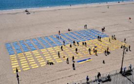 300 blue and yellow flags placed on Brighton Beach, in memory of people who perished in the bombing of Mariupol’s Drama Theater. Organized by the Ukrainian Help Center and For Freedom in Russia. NYC April 2022.