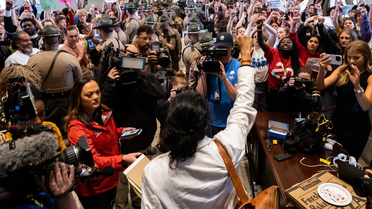 Ahead of the Tennessee House’s Monday night session, Jones marched with a police escort from City Hall to the state Capitol, where protesters chanted, “Welcome home!”