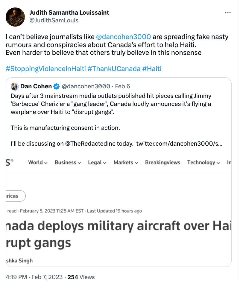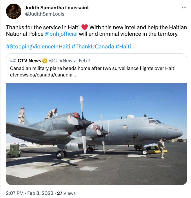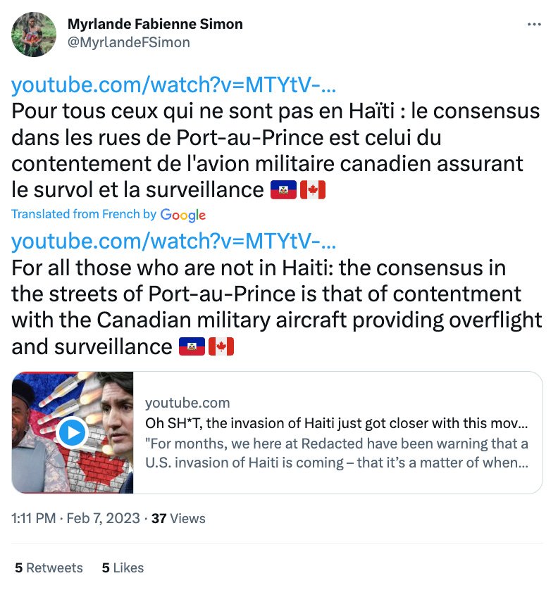 Another account tweeted the Youtube link to my Redacted report, claiming to be in Haiti and saying that “The consensus in the streets of Port-au-Prince is that of contentment with the Canadian military aircraft providing oversight and surveillance.”