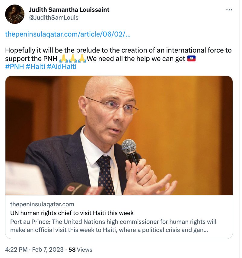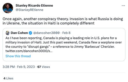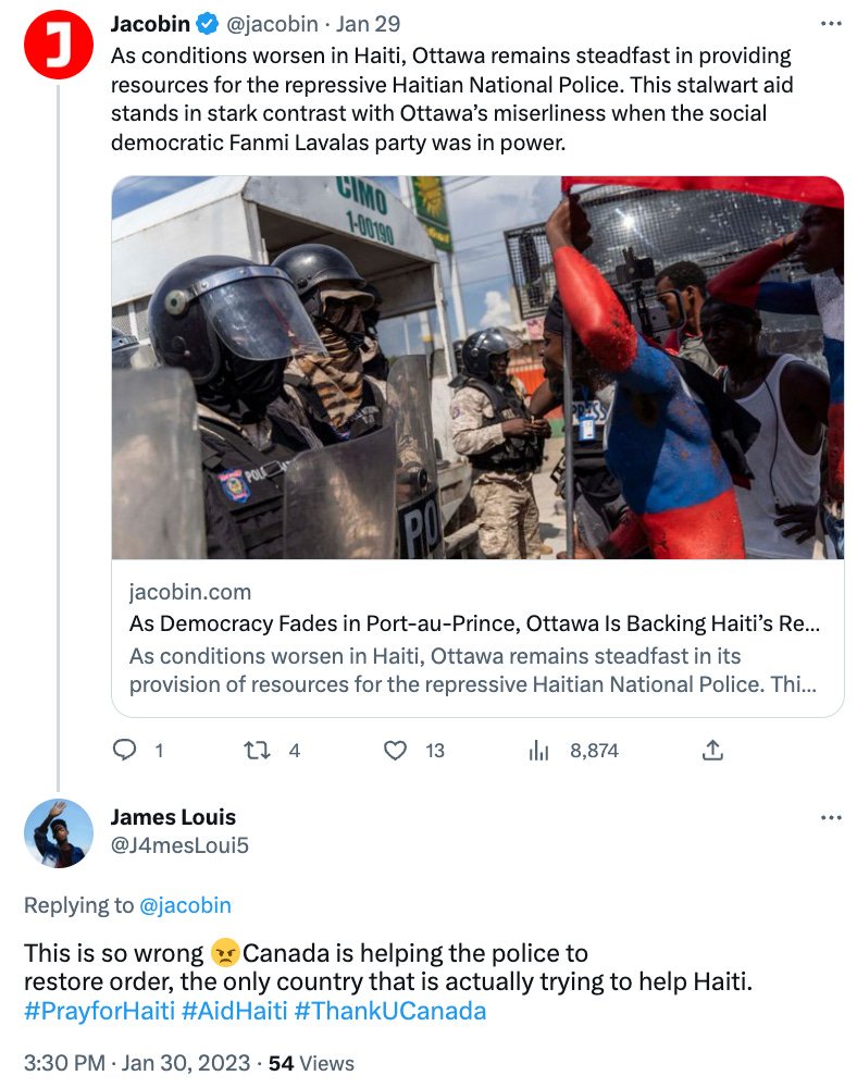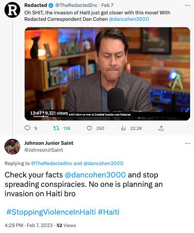 The account that commented on my Redacted report, @JohnsonJrSaint, was created in January 2023, as Biden officials and Canadian Prime Minister Justin discussed military intervention amid a summit in Mexico, and Haitian government of unelected prime minister Ariel Henry signed an MOU with Canada to “strengthen the capabilities of the Haitian Police and facilitate cooperation.” Trudeau commented that “We’re all very aware that things could get worse in Haiti and that’s why Canada and partners, including the United States, are preparing various scenarios if it does start to get worse.”