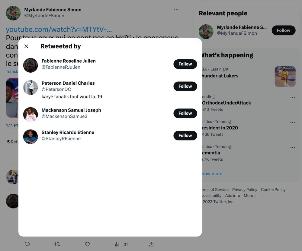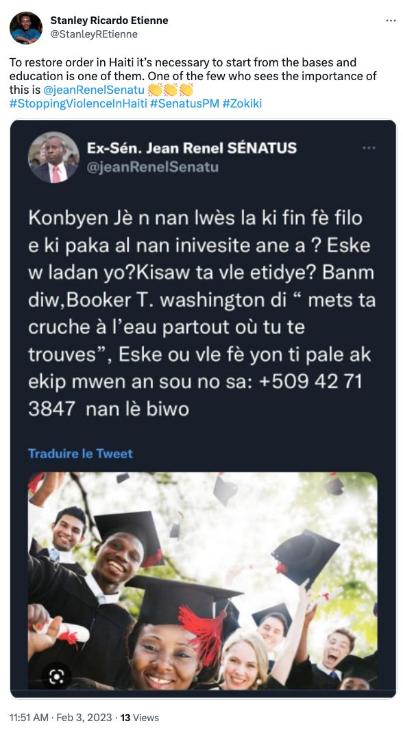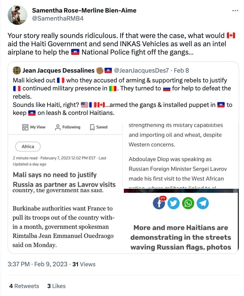 They also have a political agenda beyond intervention. Numerous troll accounts (examples: 1, 2, 3, 4, 5, 6, 7, 8, 9, 10, 11) promote the Haitian politician and former senator Jean Renel Senatus to replace Ariel Henry as prime minister. Many use the hashtag #senatuspm.