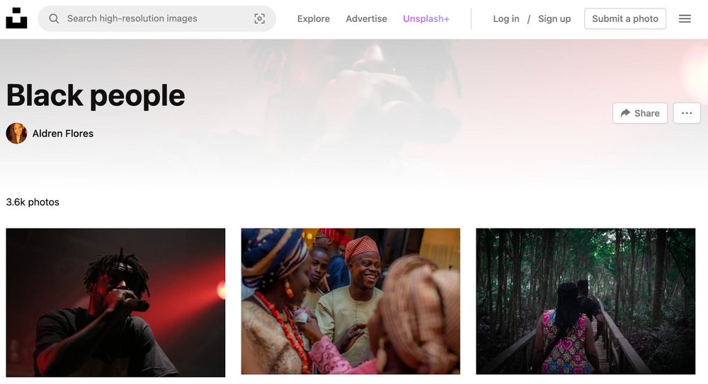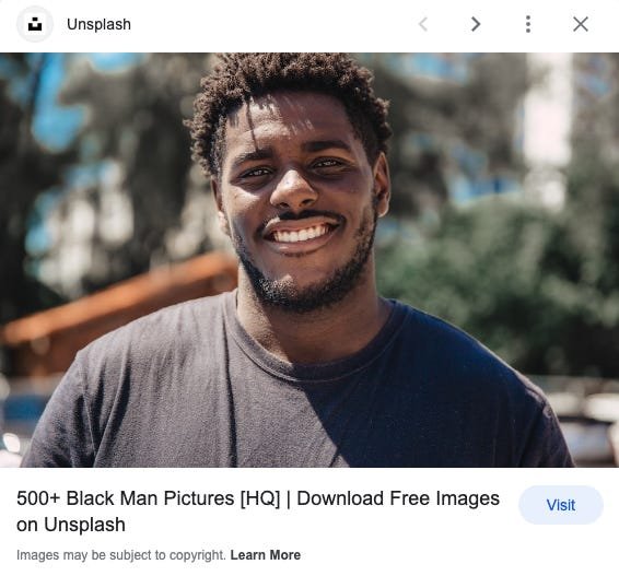 A Google image source search reveals the origin on Unsplash.com listed under “Black man Pictures.”