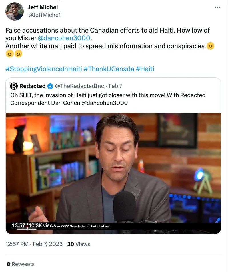 Another troll tweeted “False accusations about the Canadian efforts to aid Haiti. How low of you Mister @dancohen3000. Another white man paid to spread misinformation and conspiracies.”