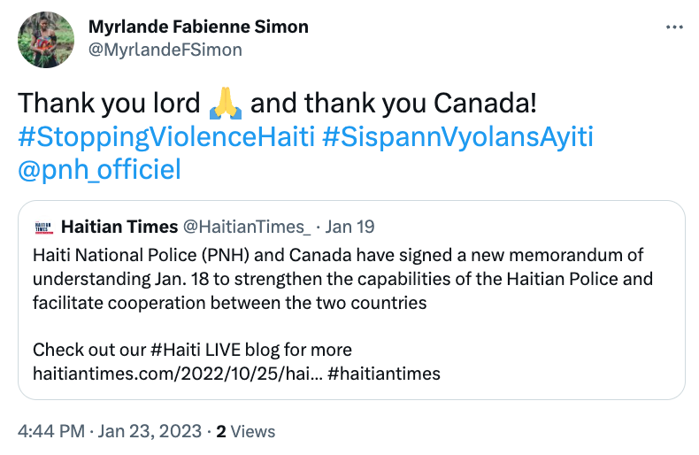 Its first tweet is praising the signing of the Canadian government/Haitian National Police MOU.