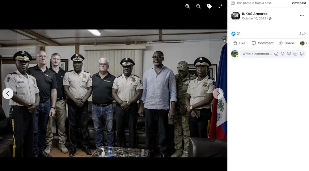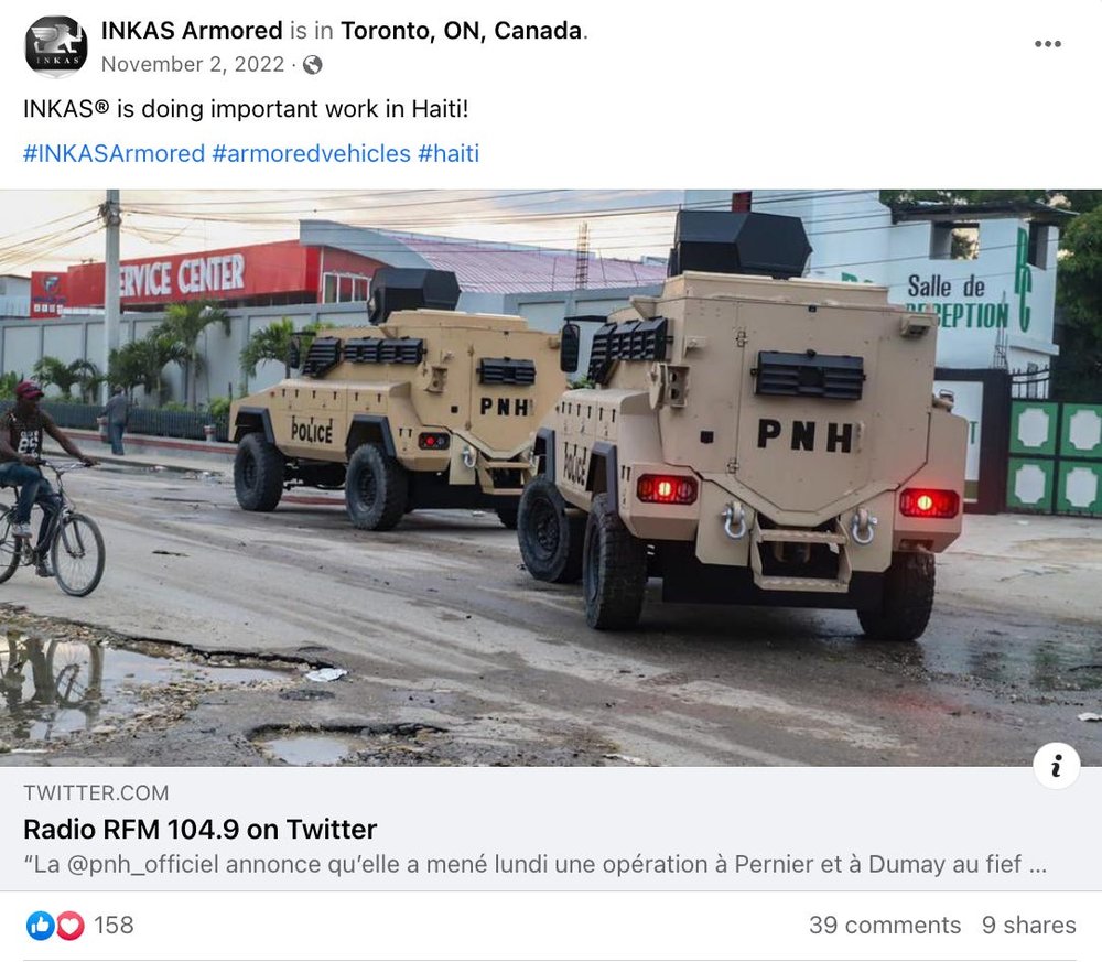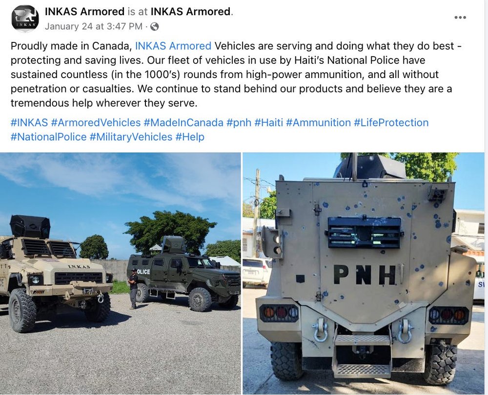 On January 24, 2023, after the MOU was signed, INKAS boasted on Facebook that its “fleet of vehicles in use by Haiti’s National Police have sustained countless (in the 1000’s) rounds from high-power ammunition.”