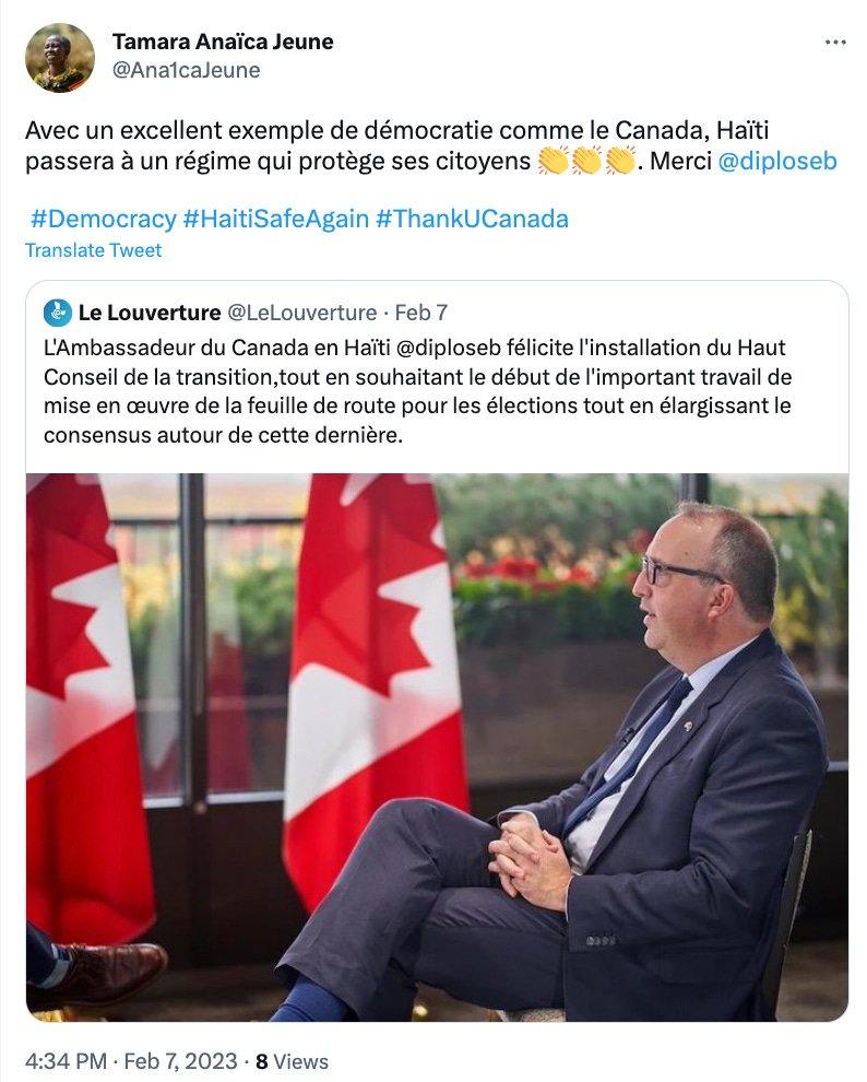 The same troll account thanked Sébastien Carrière, Canada’s ambassador to Haiti, and Bob Rae, Canada’s representative at the UN.
