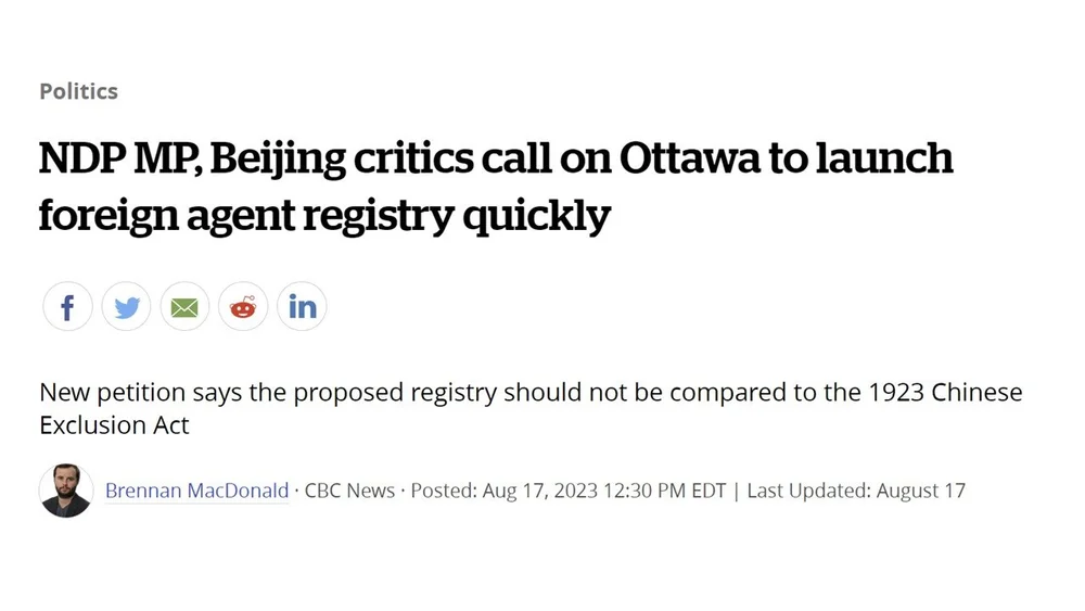 Recently NDP MP Jenny Kwan launched a petition calling for a foreign-agent registry. The Vancouver MP participated in a Toronto press conference promoting a parliamentary petition responding to another petition backed by Canada-China Focus, Canadian Foreign Policy Institute, Hamilton Coalition to Stop the War and other leftist groups. Calling on the government to “reconsider its proposed Foreign Influence Transparency Registry”, the left petition cautioned against “serious harassment and stigmatization risk for racialized communities.” It further noted, “A broad definition of foreign influence could infringe on Canadians’ charter rights while stifling international business and civil society links that are beneficial for Canada. It could also create a chill within vulnerable communities, leading them to withdraw from civic engagement and public service, which will result in their further marginalization.”