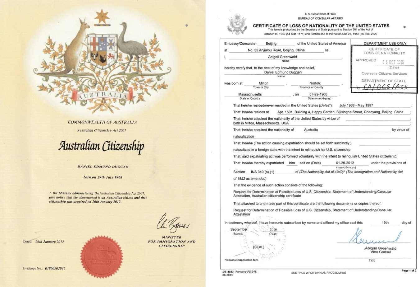 While Duggan took the extraordinary step of renouncing his US citizenship in 2016 (above right) it didn’t matter legally. He was already a sole Australian citizen.