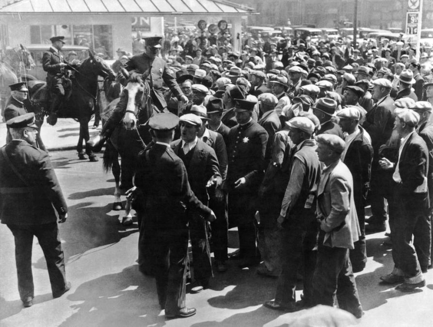 Police confront workers ahead of the West Coast Waterfront Strike, in San Francisco, California, on May 8, 1934. (Underwood Archives / Getty Images)