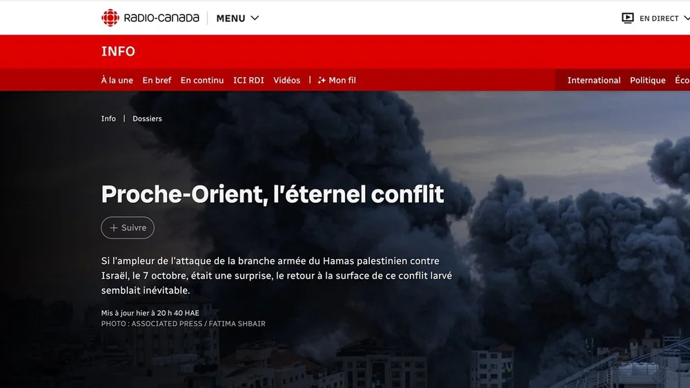 To reinforce this feeling of helplessness in their readers, Radio-Canada, the French CBC, came up with a clever way to dash anyone’s hopes of resolving this conflict. Under each and every article about the Middle East for the last few years, they include the subtitle “l’éternel conflit”, “Eternal Conflict” in English. It’s used as a category name that conveniently appears at the top of every single article.