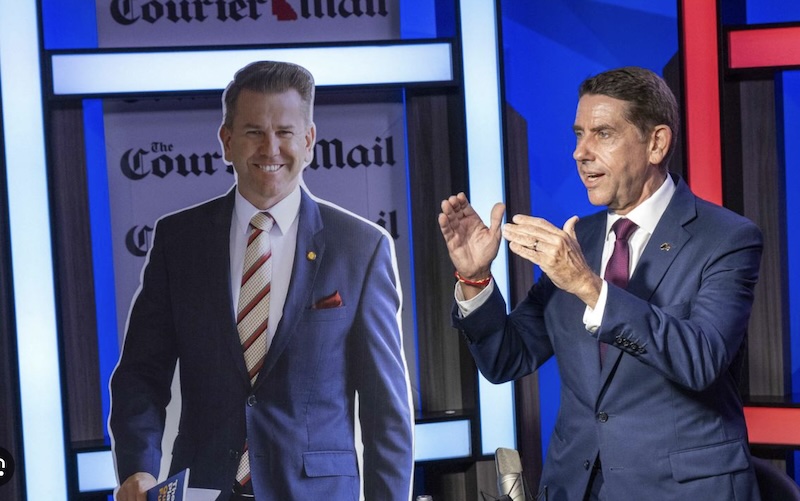 A televised Deputy Leaders’ debate sponsored by the state’s dominant Murdoch-owned paper, The Courier-Mail, against a bright blue studio backdrop and a live audience, with the paper’s state political editor “moderating” a debate between Deputy Premier and Treasurer Cameron Dick and … wait for it, wait for it … a cardboard cut-out of the LNP Deputy Leader Jarrod Bleijie.
