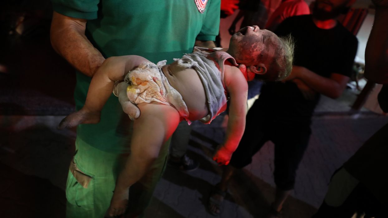 Injured young man hugs body of child killed in Israeli strike on Jabalia refugee camp(Photo by Dawoud Abo Alkas/Anadolu via Getty Images)