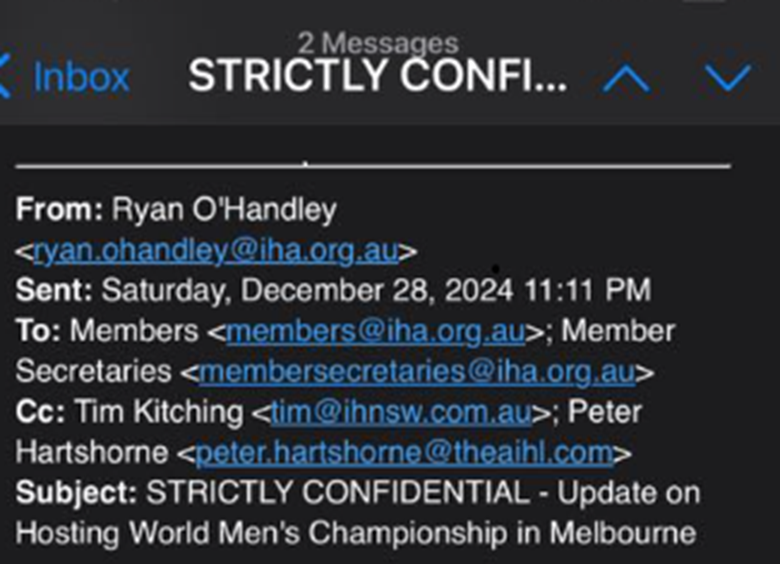 “Subject: STRICTLY CONFIDENTIAL – Update on Hosting World Men’s Championship in Melbourne