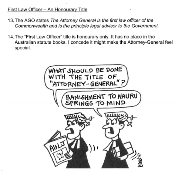 It might come as a surprise to some, but the Attorney-General has no constitutional or statutory role as government legal adviser. He’s been divested of the responsibility for giving legal advice under various Acts that allocates the legal work of the Commonwealth to the Solicitor-General, the Australian Government Solicitor, the Office of Parliamentary Counsel and the Director of Public Prosecutions.