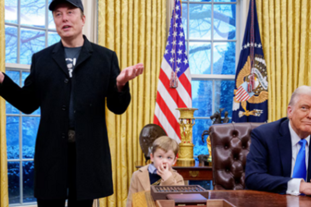 The day before, the freaks put in a “jarring,” take-my-presidency appearance in the Oval Office, ostensibly for Trump to sign (another!) executive order to continue the looting and expand the power of Musk’s DOGE, never mind the flood of lawsuits and court orders they face for slashing cancer research, kids’ education, food for poor people and your Social Security in a flagrantly illegal power grab. In a bizarre spectacle, Trump hunched behind the Resolute desk, mostly silent, hands folded, eyes vague, randomly nodding – often impotently babysitting Musk’s fidgety four-year-old son X while ignoring X’s whispered entreaty he had to pee and scowling as he picked his nose and wiped what he found on the sacred desk – while the Nazi native son of South Africa and richest guy in the room stood tall in his heedless black t-shirt and cap and offered up to the gaggle of press a load of chutzpah and bullshit to elucidate how American democracy works, or doesn’t.
