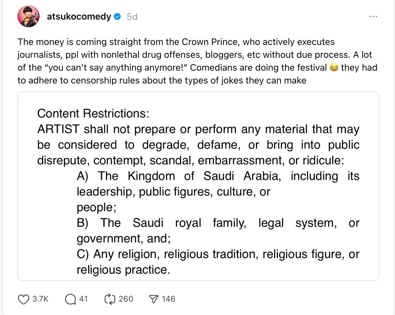 But this week, we got a look at a different possible future for comedy under authoritarianism, when American comedian Atsuko Okatsuka publicized the artist contract for the Riyadh Comedy Festival (Saudi Arabia’s first global comedy event), which opened September 26 and runs through October 8. That contract barred criticism of the host country, the Saudi royal family, and jokes about religion: