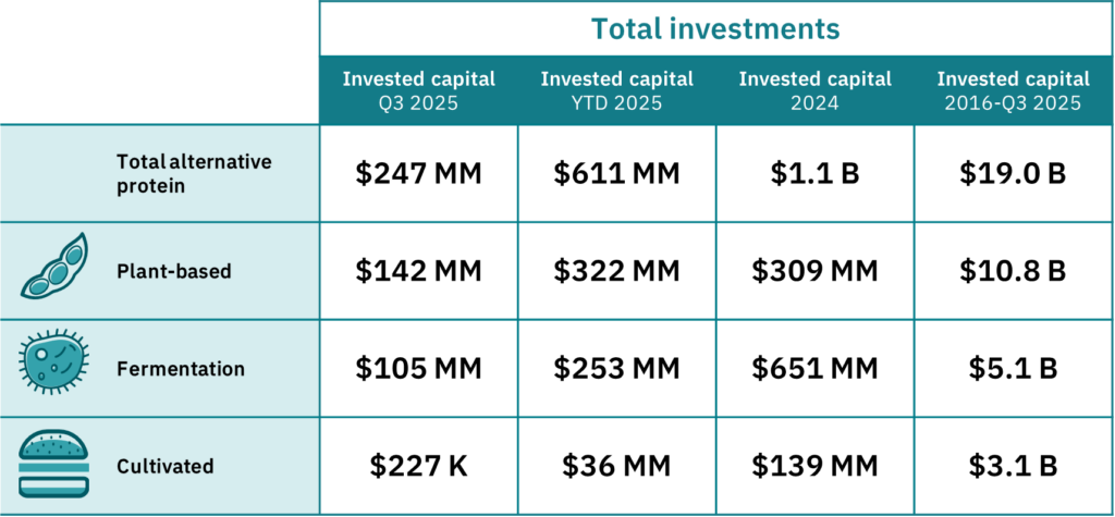Can the industry sustain this bit of momentum? Is it past the trough of illusionment? It’s worth noting that investors pumped $1.1B into alternative proteins last year – as of Q3 2025, that cumulative total sits at just $611M thus far.
