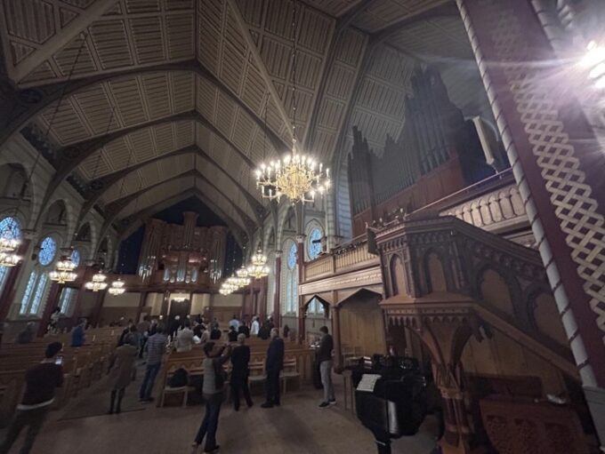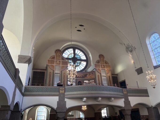 The festival’s loudest organ is in the cavernous Vasa Church, a hulking edifice from 1908 whose name conjures thoughts of the extravagant, not to say overweening, Swedish ambition embodied in the ill-fated eponymous warship that sank on its maiden voyage in August of 1628 before it could even get out of Stockholm’s harbor. Both the Vasa Church and its contemporaneous organ glow, but also glower, in their Norse Art Nouveau splendor. The scale and magnificence of the architecture and decoration show no sign of the secularizing revolution that would soon, literally, gather steam. At the time the Vasa Church went up, Christianity was still on the advance and much of the music—not just of a Scandinavian cast, but also English, German, French, and American—heard there in many recitals last week matched the Medieval Monumentalism of its surroundings. Tiny by comparison, the battlements of the Norrlanda organ found their later-Christian counterpart in the twin crosses on the Vasa’s façade. Colossal Romantic works rumbled and echoed, sonically buttressing the neo-Romanesque arches off of which also bounced the occasional spate of more contemporary music. Throughout the festival, but especially in the Vasa Church (which is about a tenth the size of Trump’s Ballroom), it was impossible to fix oneself in time and space. Indeed, the point was not to.