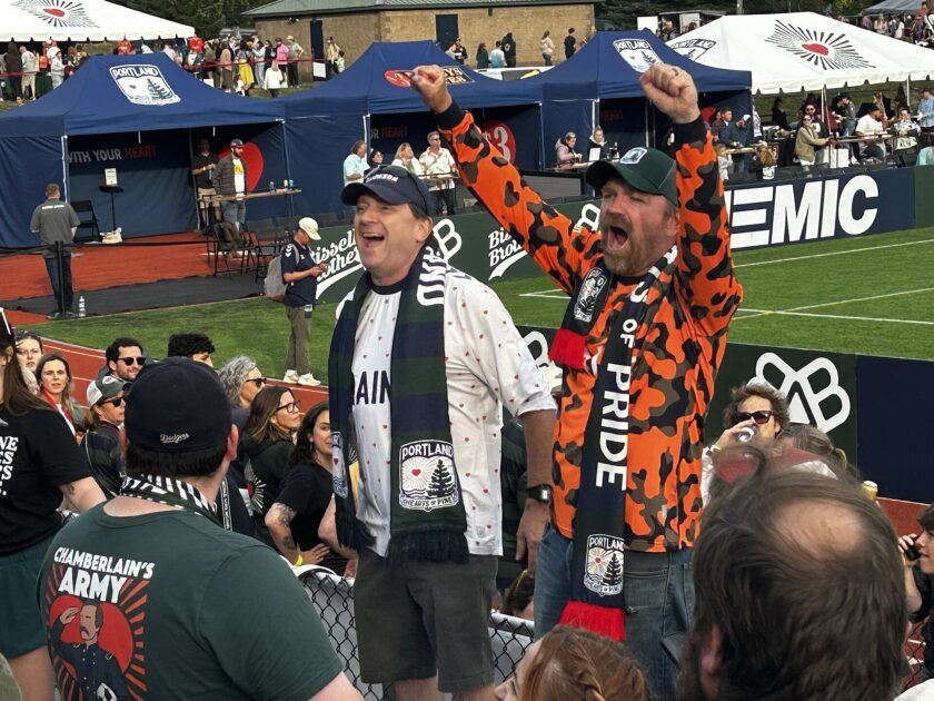 Platner campaigning with former Maine Senate president Troy Jackson, a Maine gubernatorial candidate in 2026, at a Portland Hearts of Pine match on September 27, 2025. Photo: CC BY-SA 4.0.