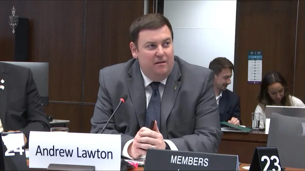 Conservative MP Andrew Lawton speaks during a Canadian Parliament committee hearing on October 9, 2025. Source: ParlVu