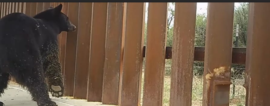 [A black bear obstructed by the new 30-foot-high border wall at the nearby San Pedro River. Credit: Sky Island Alliance]