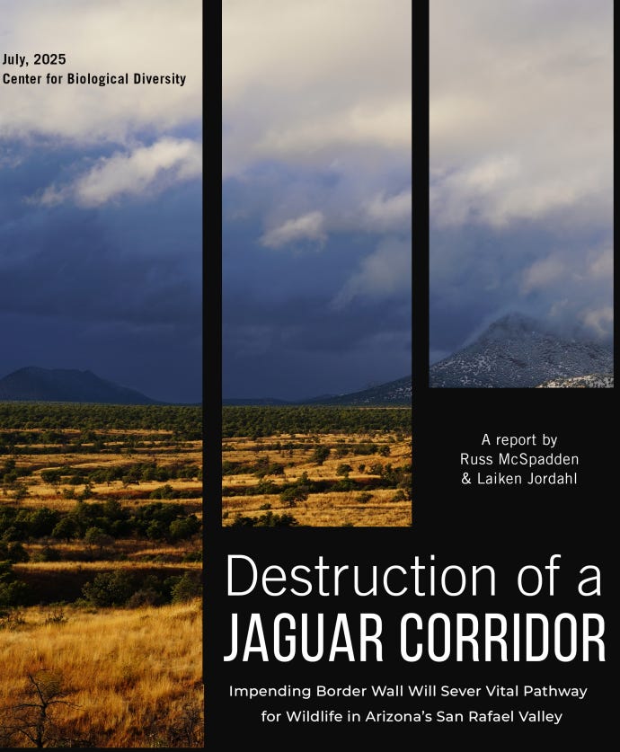 This report documents the San Rafael Valley’s biodiversity, the species it sustains, and its indispensable role in the survival of endangered wildlife. It details nine key protected areas linked by the San Rafael Valley wildlife corridor. Finally, it also outlines the severe harms posed by new border wall construction and makes the urgent case for protecting this irreplaceable corridor before it is destroyed. — Destruction of a JAGUAR CORRIDOR … Impending Border Wall Will Sever Vital Pathway for Wildlife in Arizona’s San Rafael Valley