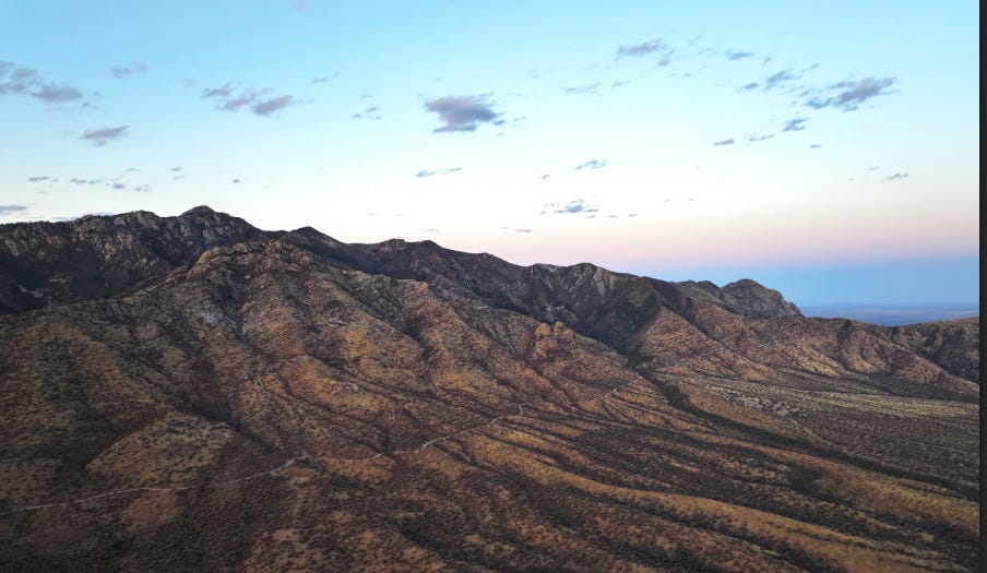 He holds up the sands of mountain heads and tectonic fissures splayed, from peaks like a purple haze over the Old Pueblo he learned are called Madrean sky islands. His hands soothe flecks of iron ore, pulverized by plates crushing and churned into tsunamis of flash floods booming into Sonora from pine and fir quarries forty miles away.