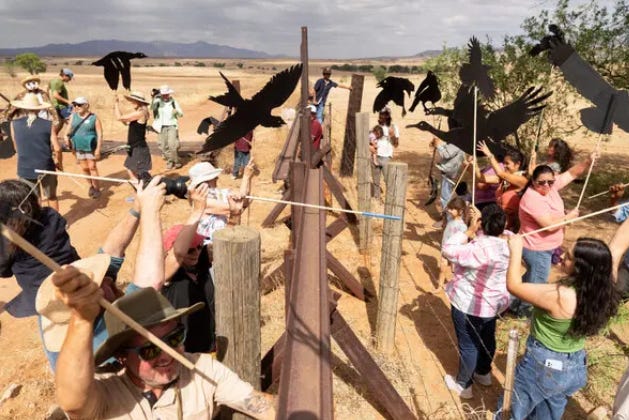 [Demonstrators on both sides of the border in the San Rafael Valley protested plans for a new wall in May with cardboard cutouts to symbolize local biodiversity.Credit…Rebecca Noble/Reuters]