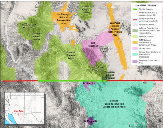 Hundreds of miles of border walls have already severed much of the Arizona–Sonora borderlands, blocking wildlife corridors, fragmenting ecosystems, and pushing endangered species closer to extinction. In the Sky Islands region — one of the most biologically rich and ecologically interconnected wildlands in North America — only a few unwalled cross-border corridors remain. One of the most important of these, the San Rafael Valley, is now in the crosshairs of the Trump administration for immediate new border wall construction.